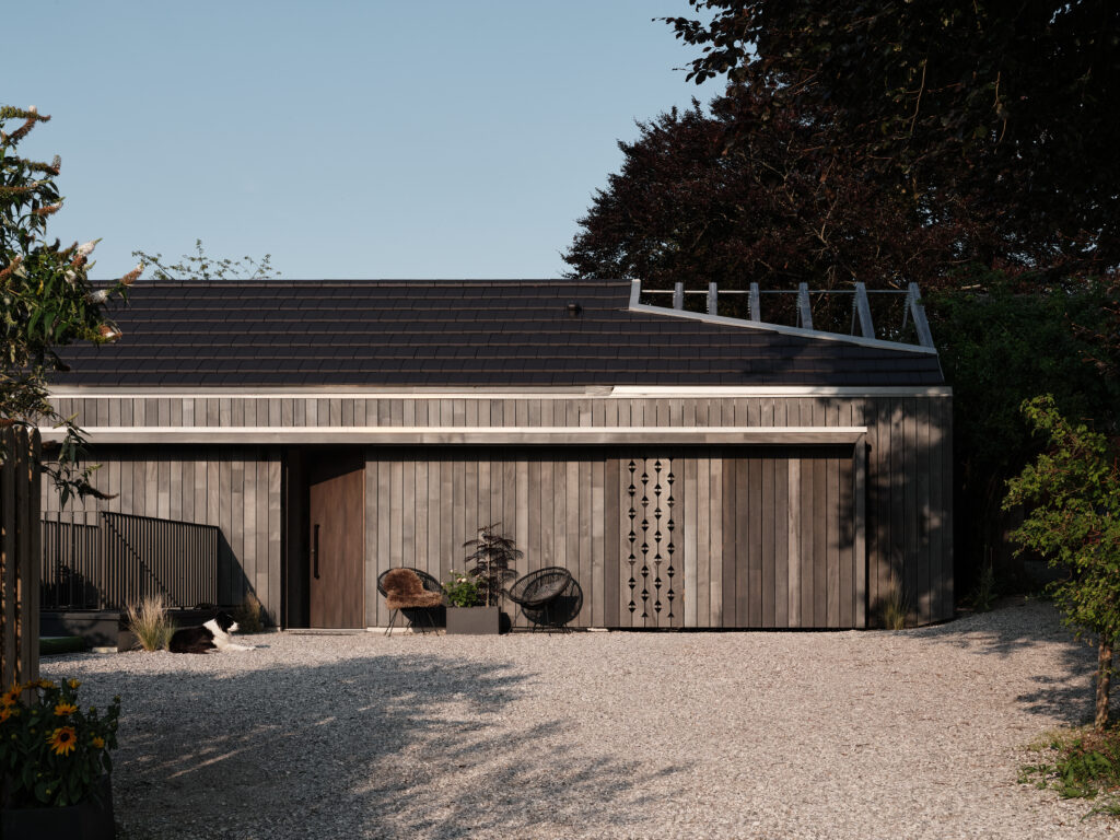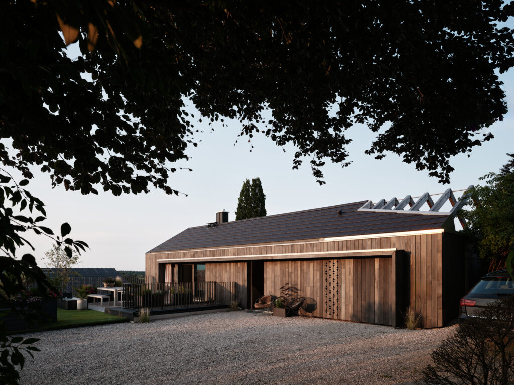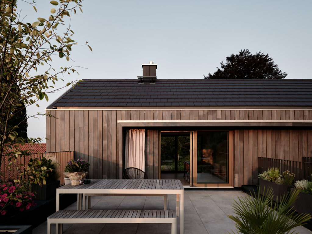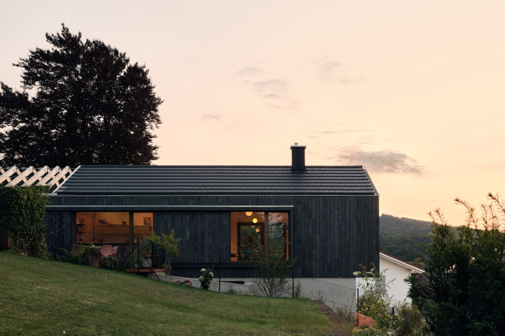 Es entstand dieser teilweise eingeschossige Bungalow dessen Nutzungen sich in das zur Hangseite freiliegende, quer angeordnete Untergeschoss ziehen.
